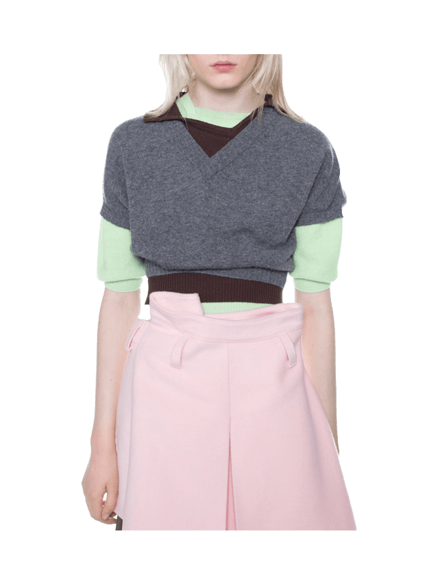 The clothes on the rail prove why. In the flesh, they lift my spirits, cure my hangover, clear my skin. A deliciously deranged cocktail dress is composed of crumpled twists of sugar-pink taffeta, overlaid with lace and spliced with chintzy metallic damasks and scrims of tulle. Cropped chestnut polo knits have side seams subbed out for zips that curl down and around the flank, from the back of the shoulder to the front of the hip; layered plaid shirts come with multiple necklines; a puffball skirt in ditsy floral organza floats beneath the rack like a jellyfish on a current.